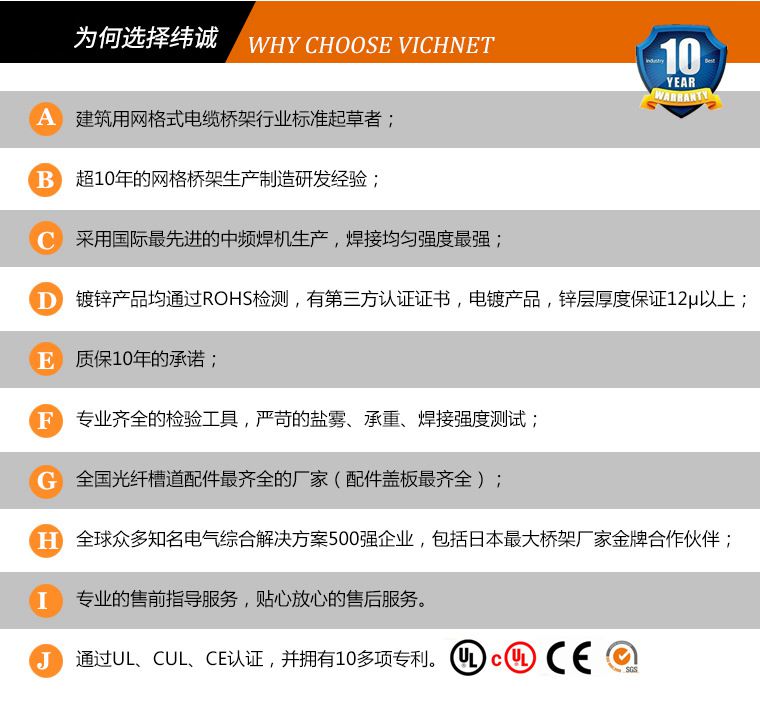 纬诚公司在全球范围内首先推出网格桥架10年质保承诺。我们每一批线材都经过严格的成分检测;网格桥架电镀锌层厚度≥12微米,热镀锌厚度≥60微米,且镀层厚度均匀,能有效抵抗腐蚀。